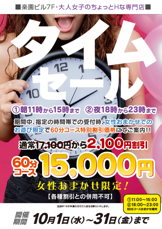■『タイムセール』 早番11:00~1500 遅番18:00~23:00 期間中、指定の時間で受付頂いたお客様は、女性おまかせのお遊びで60分コースを15,000円でご案内!!(各種割引との併用不可) 通常料金よりも2,100もお得です♪ この機会に、色々な女性と遊んでみて下さいね!